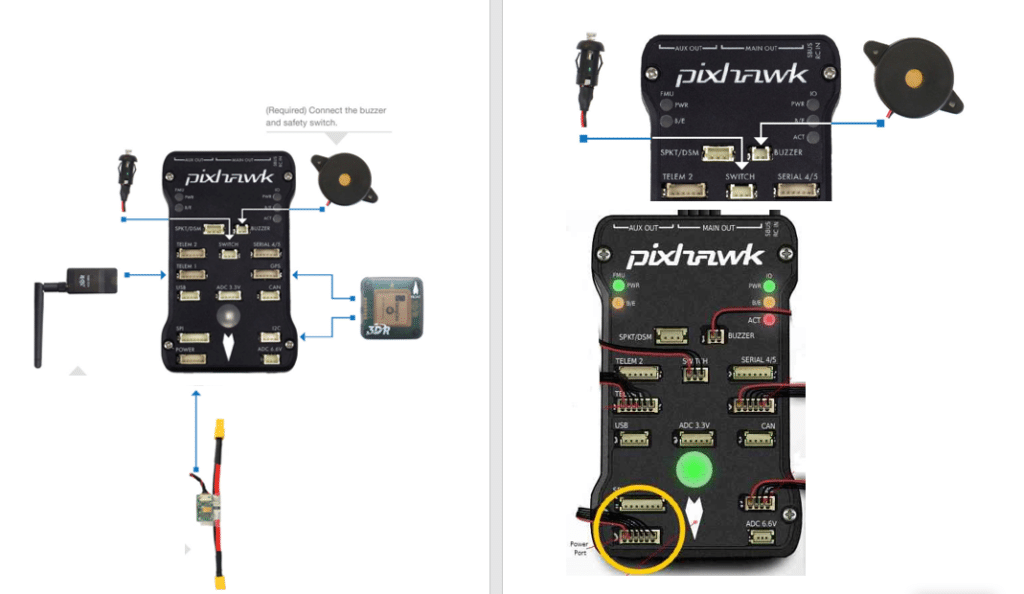 - Safety Button: The safety button is a critical component that allows you to disarm the motors in case of an emergency. Locate the designated port on the Pixhawk for the safety button and connect the included button using the provided cable.